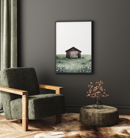 Watercolor Cabin Art Print – Rustic Lake House Wall Decor